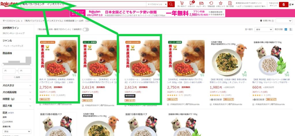 ・各通番サイトで販売されているイリオスマイル馬肉(馬肉パラパラミンチ)の価格を比較すると公式サイトと楽天(公式)の初回限定お試し価格が最安値という事が分かった。