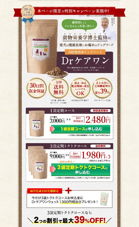 ドクターケアワンは公式サイトから定期コースでまとめ買いすると最大39%お得に購入することが出来ます。