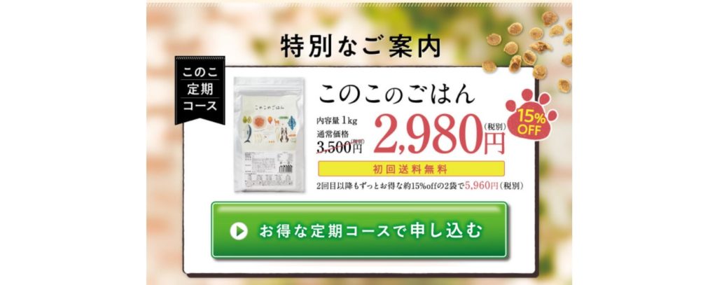 このこのごはんを公式サイトから定期コースで購入すると通常価格より15%お得に購入することが出来ます。