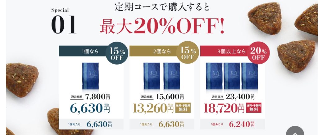 ネルソンズドッグフードを公式サイトから定期コースで購入すると、通常価格より最大20%オフで購入することが出来ます。