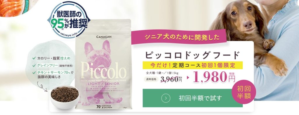 公式サイトの定期コースからピッコロドッグフードを購入すると初回分のみ通常価格の50%オフ、1980円で購入することが出来ます。
